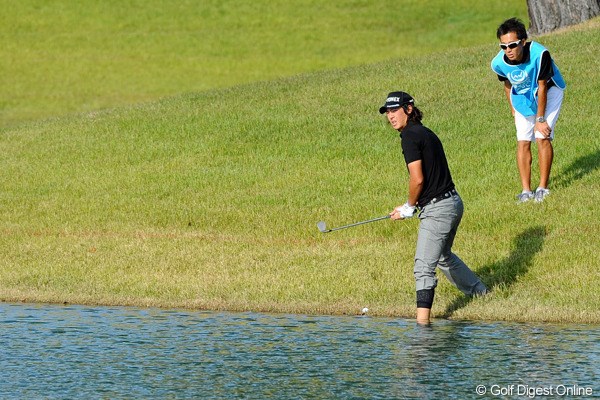 ボールはかろうじて芝の上だが、ウォーターハザードの範囲内。クラブを地面につけて構えられない状況で、左足だけシューズと靴下を脱いだ。ピンまで残り83ヤードにサンドウェッジを手にしたが、ボールはグリーンの10ヤード手前に大きな水しぶきを上げた。