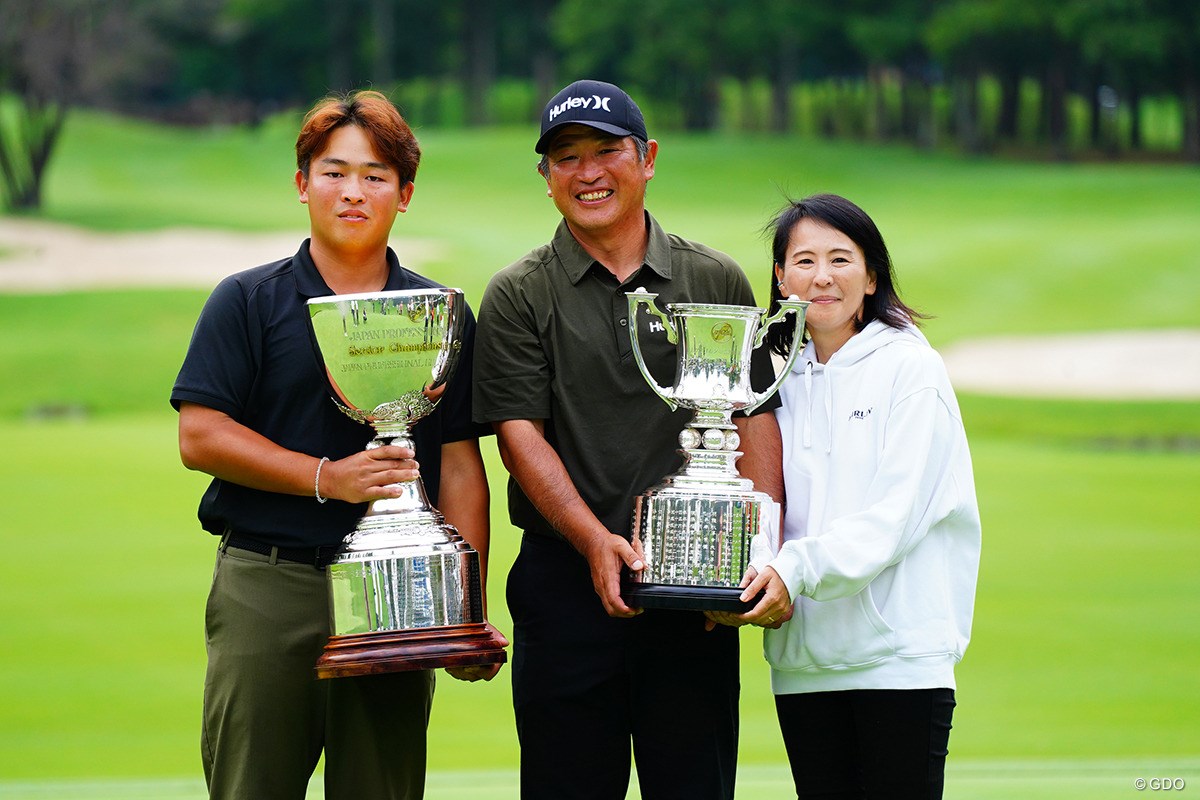 兵庫県開催の「ACNチャンピオンシップ」でレギュラーツアーに初出場した今週、予選落ちして前日5日(土)にコースを去った。千葉県の平川CCに所属し、ツアープレーヤーを目指して腕を磨く身。この日は一般ゴルファーのキャディの仕事を務めた後、茨城県まで駆け付けた。「(優勝して)良かったなというのと、一段と背中が遠くなったな…という感じです」。家族での記念撮影。父に持たされた優勝カップは、想像以上に重かった。