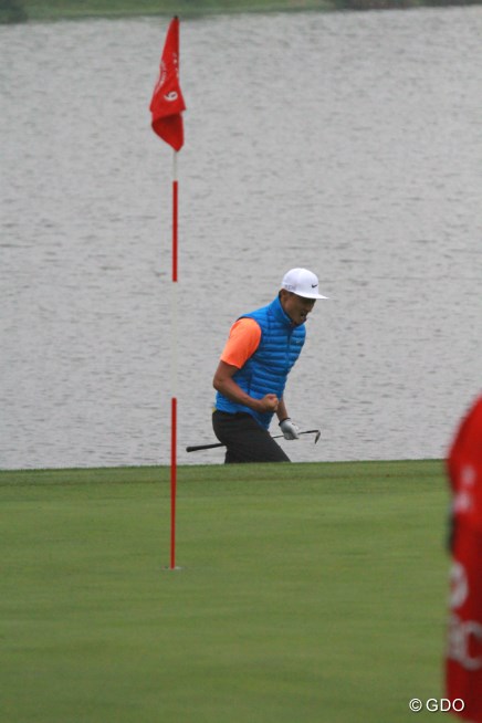 9番では2打目をグリーン右の池に落としながら、ドロップ後の4打目を直接沈めるチップインパー。タイガー・ウッズばりの派手なガッツポーズでギャラリーの興奮をあおると、終盤16番では10m以上のバーディパットを沈めてバンザイ。続く17番でもバーディを決めて右拳を握りしめ、18番をパーで締めると、拍手喝采するギャラリーへ向かっていくつもの球を投げ込んだ。