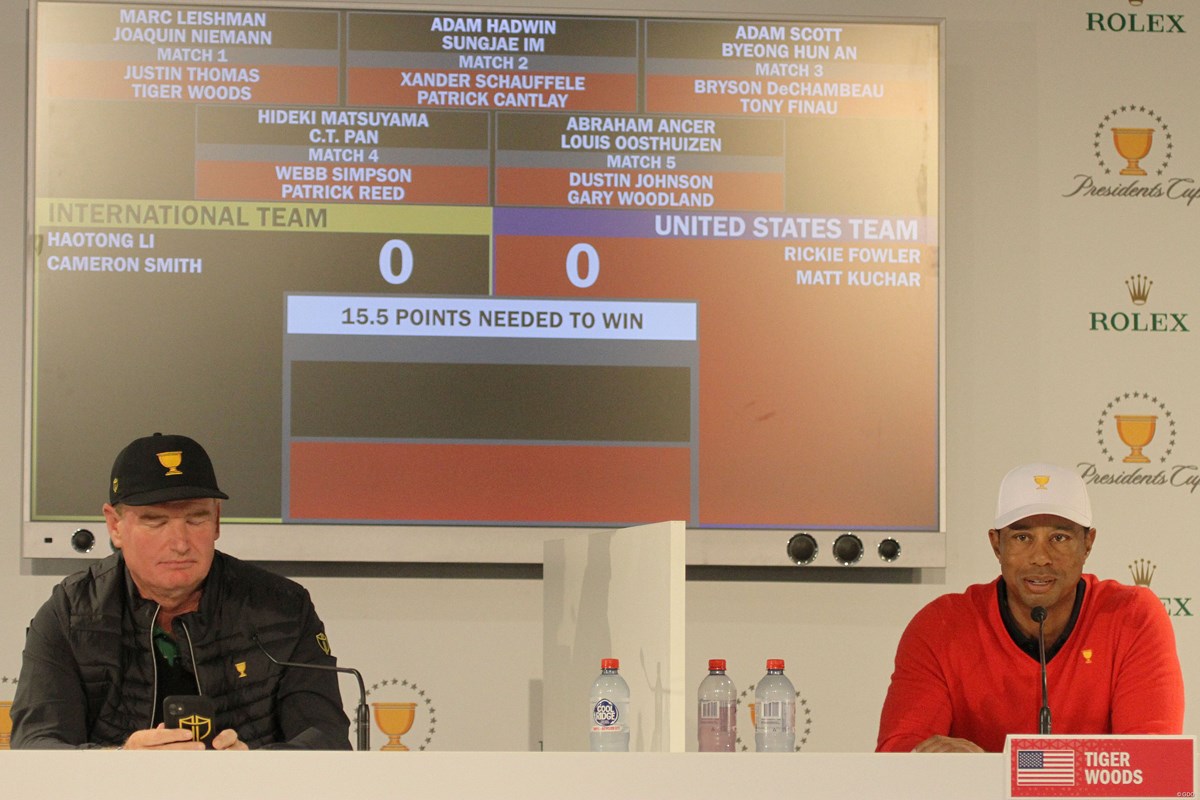 いきなり会見場がどよめいた。両軍の首脳陣が向かい合って座り、キャプテンが順番に選手(組)を選んでいく恒例の対戦発表。世界選抜が最初にマーク・レイシュマン(オーストラリア)&ホアキン・ニーマン(チリ)組を選ぶと、米国選抜の“監督兼選手”タイガー・ウッズは1分ほどチーム内で話し合いを持った。そして「ジャスティン・トーマス…タイガー・ウッズ」。トーマスをコールし、さらに間を置いて自らの名前を読み上げると、世界各国の記者から「オ~」と声が漏れた。