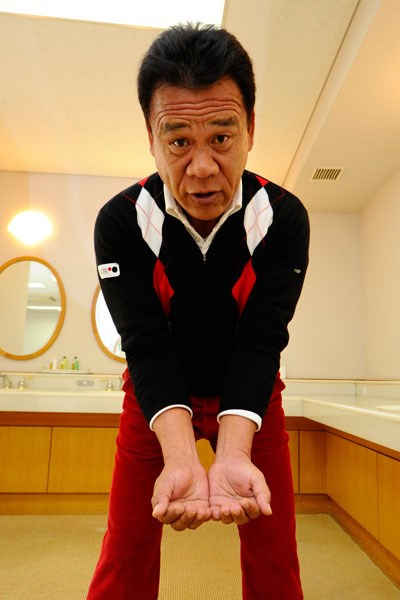 両手で水をすくうときの姿勢に、いいアドレスの要素が詰まっていると青山プロ。「ひざが軽く曲がり、状態は自然に前傾、水をこぼさないようにわきを締める。理想的な構えです」